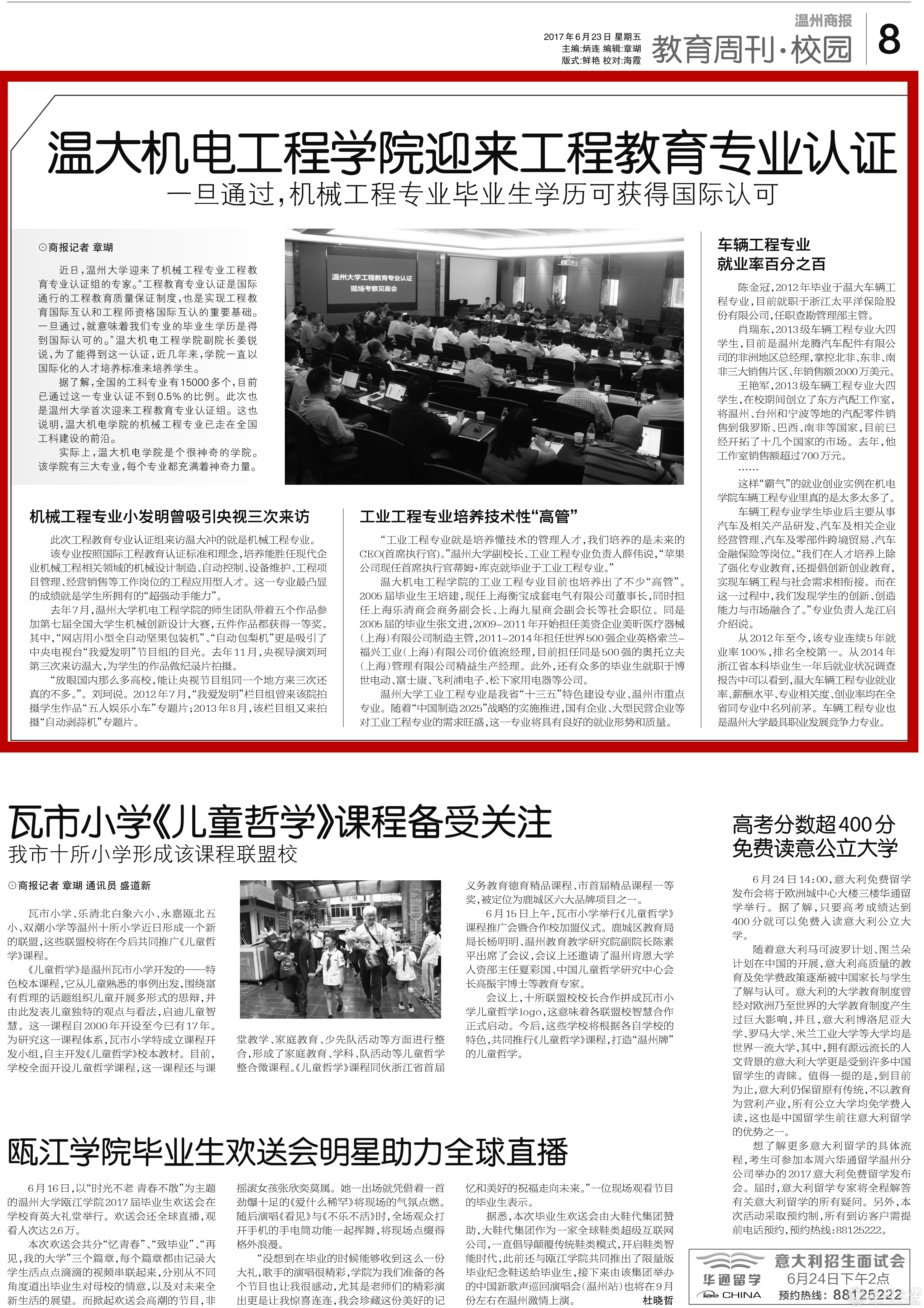近日,小宝影院 迎来了机械工程专业工程教育专业认证组的专家。“工程教育专业认证是国际通行的工程教育质量保证制度,也是实现工程教育国际互认和工程师资格国际互认的重要基础。一旦通过,就意味着我们专业的毕业生学历是得到国际认可的。”温大机电工程学院副院长姜锐说,为了能得到这一认证,近几年来,学院一直以国际化的人才培养标准来培养学生。