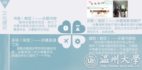 走进步晨楼,一楼“步晨书房”便跃入眼帘,占地约50平米,拥有藏书约2500册,和校图书馆的图书借阅系统同步,学生足不出“区”就可以借阅退换书籍。二楼的步青空间,可以举办书香“嗅觉”(歩晨图书交流会)、光影“视觉”(电影放映厅)、茶道“味觉”(茶道工坊)、墨韵“触觉”(书画馆)为主题的文化大餐,这是步晨楼根据楼栋物电和美术专业女生特点,重点打造“书香满屋”文化项目和“文艺型”楼栋。作为一楼一品建设的缩影,学区的10栋楼,都已形成了自己的特色风格,打造出了自己的楼栋文化项目。