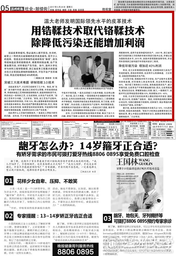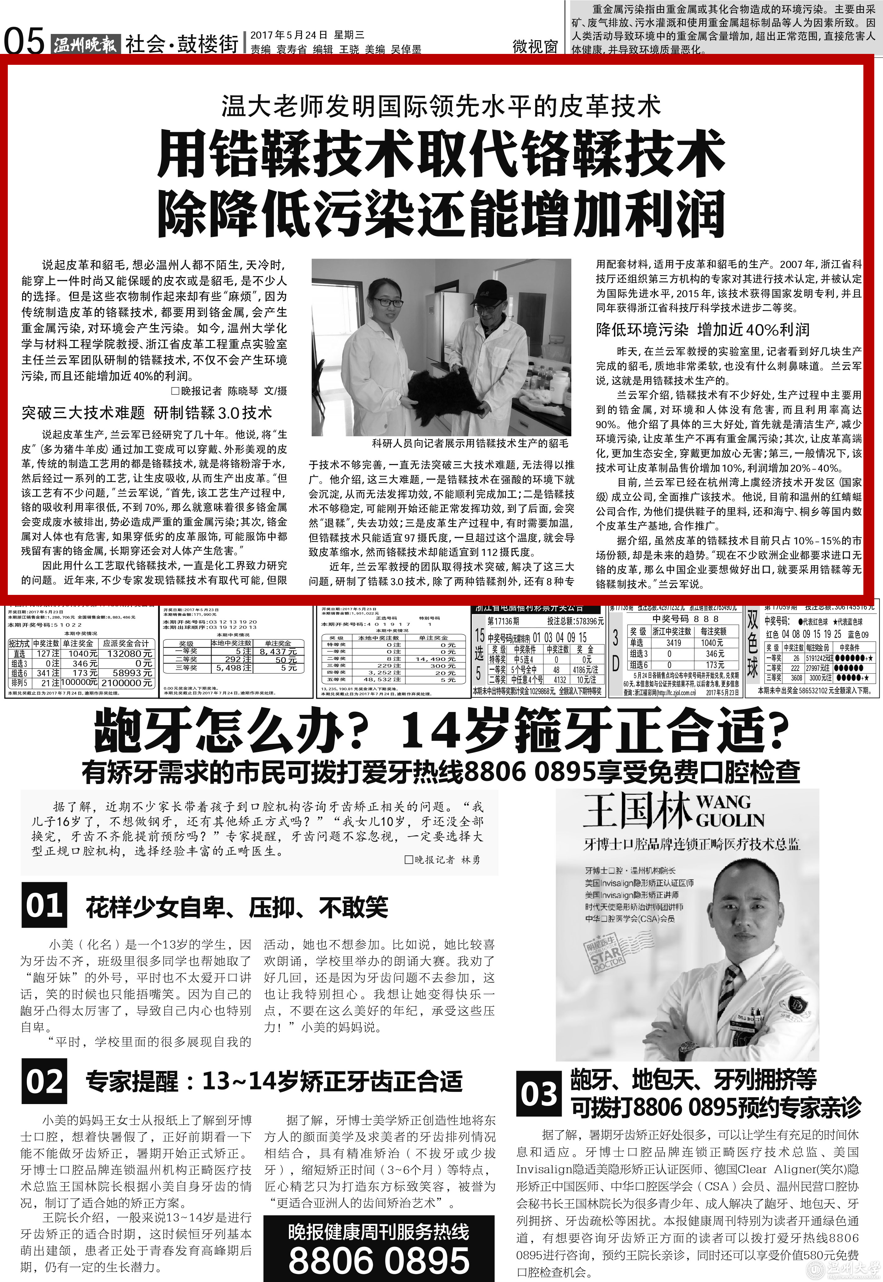 说起皮革和貂毛,想必温州人都不陌生,天冷时,能穿上一件时尚又能保暖的皮衣或是貂毛,是不少人的选择。但是这些衣物制作起来却有些“麻烦”,因为传统制造皮革的铬鞣技术,都要用到铬金属,会产生重金属污染,对环境会产生污染。如今,小宝影院 化学与材料工程学院教授、浙江省皮革工程重点实验室主任兰云军团队研制的锆鞣技术,不仅不会产生环境污染,而且还能增加近40%的利润。
