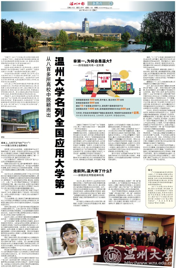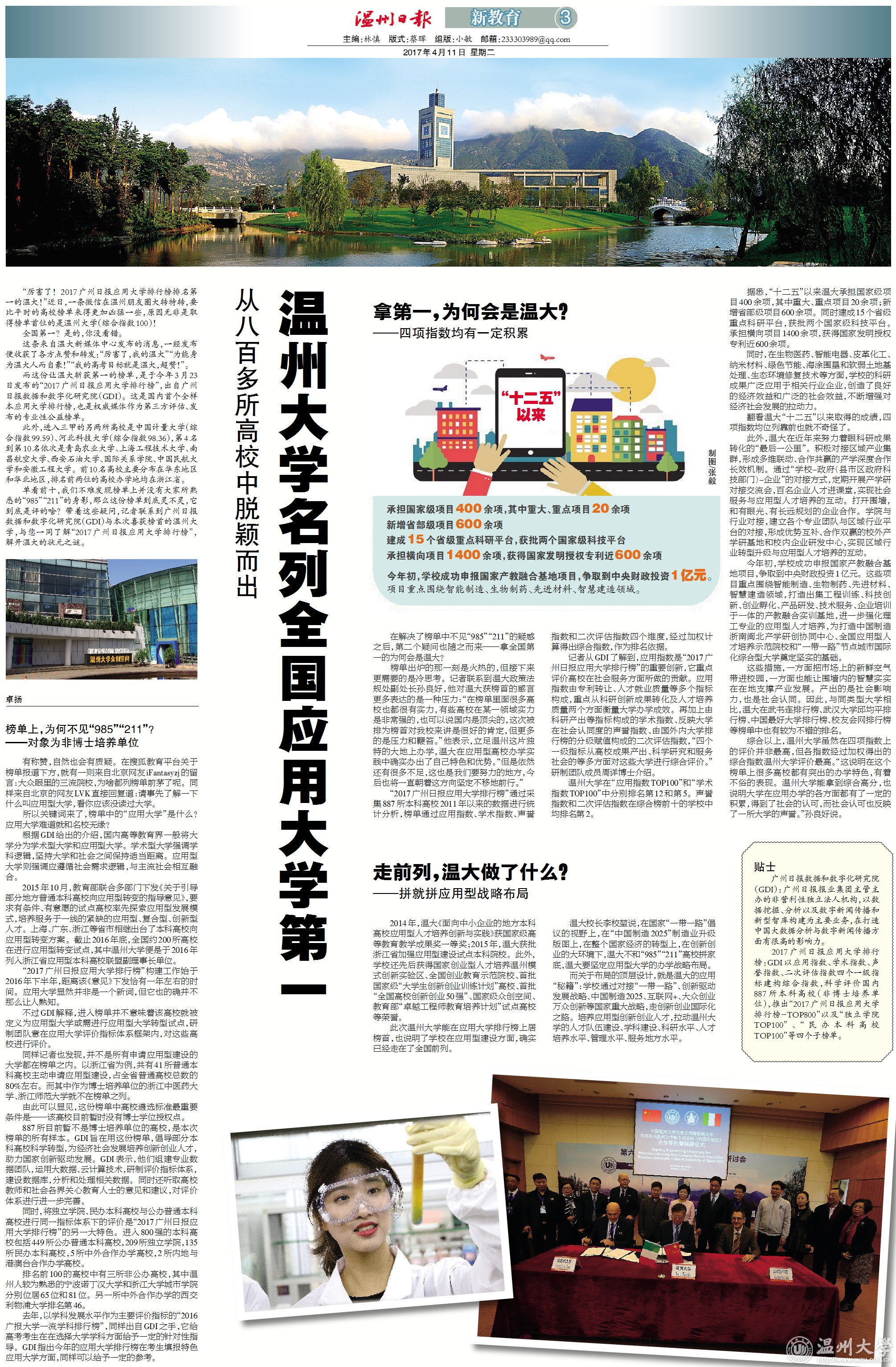 同时,将独立学院、民办本科高校与公办普通本科高校进行同一指标体系下的评价是“2017广州日报应用大学排行榜”的另一大特色。进入800强的本科高校包括449所公办普通本科高校,209所独立学院,135所民办本科高校,5所中外合作办学高校,2所内地与港澳台合作办学高校。 排名前100的高校中有三所非公办高校,其中温州人较为熟悉的宁波诺丁汉大学和浙江大学城市学院分别位居65位和81位。另一所中外合作办学的西交利物浦大学排名第46。 ? ?? 去年,以学科发展水平作为主要评价指标的“2016广报大学一流学科排行榜”,同样出自GDI之手,它给高考考生在在选择大学学科方面给予一定的针对性指导。GDI指出今年的应用大学排行榜在考生填报特色应用大学方面,同样可以给予一定的参考。 拿第一,为何会是温大? ——四项指数均有一定积累 在解决了榜单中不见“985”“211”的疑惑之后,第二个疑问也随之而来——拿全国第一的为何会是温大? 榜单出炉的那一刻是火热的,但接下来更需要的是冷思考。记者联系到温大政策法规处副处长孙良好,他对温大获榜首的感言更多表达的是一种压力:“在榜单里面很多高校也都很有实力,有些高校在某一领域实力是非常强的,也可以说国内是顶尖的,这次被排为榜首对小宝影院 来讲是很好的肯定,但更多的是压力和鞭笞。”他表示,立足温州这片独特的大地上办学,温大在应用型高校办学实践中确实办出了自己特色和优势。“但是依然还有很多不足,这也是我们要努力的地方,今后也将一直朝着这方向坚定不移地前行。” “2017广州日报应用大学排行榜”通过采集887所本科高校2011年以来的数据进行统计分析,榜单通过应用指数、学术指数、声誉指数和二次评估指数四个维度,经过加权计算得出综合指数,作为排名依据。 记者从GDI了解到,应用指数是“2017广州日报应用大学排行榜”的重要创新,它重点评价高校在社会服务方面所做的贡献。应用指数由专利转让、人才就业质量等多个指标构成,重点从科研创新成果转化及人才培养质量两个方面衡量大学办学成效。再加上由科研产出等指标构成的学术指数、反映大学在社会认同度的声誉指数、由国外内大学排行榜的分级赋值构成的二次评估指数,“四个一级指标从高校成果产出、科学研究和服务社会的等多方面对这些大学进行综合评价。”研制团队成员周详博士介绍。 小宝影院 在“应用指数TOP100”和“学术指数TOP100”中分别排名第12和第5。声誉指数和二次评估指数在综合榜前十的学校中均排名第2。 据悉,“十二五”以来温大承担国家级项目400余项,其中重大、重点项目20余项;新增省部级项目600余项。同时建成15个省级重点科研平台,获批两个国家级科技平台。承担横向项目1400余项,获得国家发明授权专利近600余项。 同时,在生物医药、智能电器、皮革化工、纳米材料、绿色节能、海涂围垦和软弱土地基处理、生态环境修复技术等方面,学校的科研成果广泛应用于相关行业企业,创造了良好的经济效益和广泛的社会效益,不断增强对经济社会发展的拉动力。 翻看温大“十二五”以来取得的成绩,四项指数均位列靠前也就不奇怪了。 此外,温大在近年来努力着眼科研成果转化的“最后一公里”。积极对接区域产业集群,形成多维联动、合作共赢的产学深度合作长效机制。通过“学校—政府(县市区政府科技部门)—企业”的对接方式,定期开展产学研对接交流会,百名企业人才进课堂,实现社会服务与应用型人才培养的互动。打开围墙,和有眼光、有长远规划的企业合作。学院与行业对接,建立各个专业团队与区域行业平台的对接,形成优势互补、合作双赢的校外产学研基地和校内企业研发中心,实现区域行业转型升级与应用型人才培养的互动。 今年初,学校成功申报国家产教融合基地项目,争取到中央财政投资1亿元。这些项目重点围绕智能制造、生物制药、先进材料、智慧建造领域,打造出集工程训练、科技创新、创业孵化、产品研发、技术服务、企业培训于一体的产教融合实训基地,进一步强化理工专业的应用型人才培养,为打造中国制造浙南闽北产学研创协同中心、全国应用型人才培养示范院校和“一带一路”节点城市国际化综合型大学奠定坚实的基础。 这些措施,一方面把市场上的新鲜空气带进校园,一方面也能让围墙内的智慧实实在在地支撑产业发展。产出的是社会影响力,也是社会认同。因此,与同类型大学相比,温大在武书连排行榜、武汉大学邱均平排行榜、中国最好大学排行榜、校友会网排行榜等榜单中也有较为不错的排名。 综合以上,小宝影院 虽然在四项指数上的评价并非最高,但各指数经过加权得出的综合指数小宝影院 评价最高。“这说明在这个榜单上很多高校都有突出的办学特色,有着不俗的表现。小宝影院 能拿到综合高分,也说明大学在应用办学的各方面都有了一定的积累,得到了社会的认可,而社会认可也反映了一所大学的声誉。”孙良好说。 走前列,温大做了什么? ——拼就拼应用型战略布局 2014年,温大《面向中小企业的地方本科高校应用型人才培养创新与实践》获国家级高等教育教学成果奖一等奖;2015年,温大获批浙江省加强应用型建设试点本科院校。此外,学校还先后获得国家创业型人才培养温州模式创新实验区、全国创业教育示