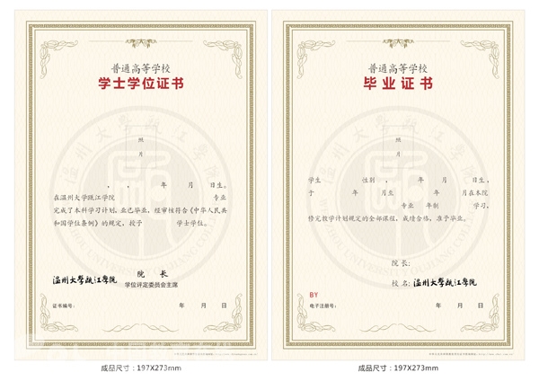 毕业证书和学位证书内芯均采用温馨的浅黄色,底纹是圆形的院标,毕业证书从上到下依次为本人两寸彩照和毕业生基本信息以及院长签名,底部是证书编号和日期等;而学位证书从上到下依次为本人两寸彩照、学位证获得者主要学位授予信息和学位评定委员会主席的签章,底部是学位证书编号和学位授予日期。 为方便学生求职、出国留学等,新版学位证书采用竖版A4尺寸,便于携带、复印与展示,同时更显美观大方。 据悉,小宝影院 瓯江学院新版毕业证书和学位证书既新颖而庄重、典雅而清新,体现了学院的文化与传承,融入了充满温馨回忆与纪念意义,充分体现了学院“厚德浚智,学成致用”的育人理念和学院勇于创新,与时俱进的精神。
