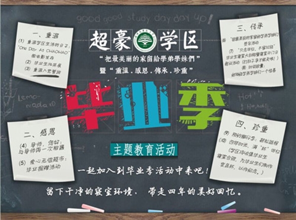 温州网讯(通讯员 翁浩)“把最美的家留给学弟学妹们!”今年的毕业季,温大在毕业生中发出了这样的倡议。学区制改革后的温大即将送走在全新育人模式下的第一批毕业生。以超豪学区为代表,各学区正紧锣密鼓地筹备和进行着别样的学区离校主题教育活动。