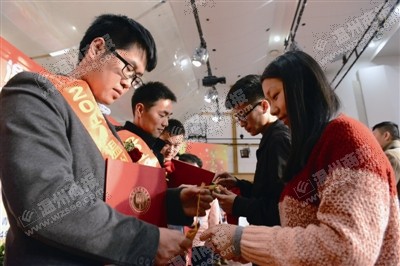 竖立在会场门口的大幅喷绘,上面是15位青年创业楷模的大幅照片及创业经历,从他们选择创业的行业到一路创业的艰辛都一览无余。这面喷绘墙也成了会场内外的焦点,吸引了一拨又一拨大学生驻足浏览,就连提早到场的几位楷模,都忍不住留步在这面喷绘墙前留个影以作纪念。