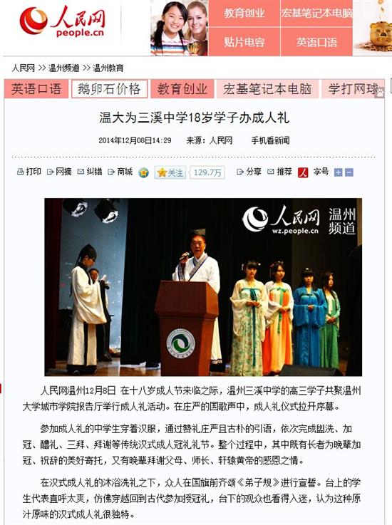 在十八岁成人节来临之际,温州三溪中学的高三学子共聚小宝影院 城市学院报告厅举行成人礼活动。在庄严的国歌声中,成人礼仪式拉开序幕。 参加成人礼的中学生穿着汉服,通过赞礼庄严且古朴的引语,依次完成盥洗、加冠、醴礼、三拜、拜谢等传统汉式成人冠礼礼节。整个过程中,其中既有长者为晚辈加冠、祝辞的美好寄托,又有晚辈拜谢父母、师长、轩辕黄帝的感恩之情。 在汉式成人礼的沐浴洗礼之下,众人在国旗前齐颂《弟子规》进行宣誓。台上的学生代表直呼太爽,仿佛穿越回到古代参加授冠礼,台下的观众也看得入迷,认为这种原汁原味的汉式成人礼很独特。 此次成人礼的一个亮点是,学生通过写家书的形式来表达对未来的憧憬。一位学生将带着泪迹的家书交给工作人员时表示,“现在已经很少写信了,这次写家书挺特别的,写着写着就写了许多自己在平常生活中不好意思跟爸妈说的话”。还有学生表示,“我已经是成年人了,应该承担起照顾家里的职责,也希望不辜负老师与家长的期望,能考上一个好的大学”。