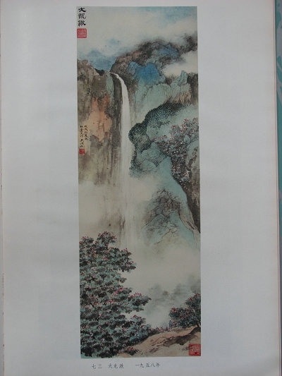 《百丈漈》次年所作。款识:“百丈漈,在浙江文成县,位于南田与大峃之间,将用为建设水电站主要水源。一九五九年一月。吴湖帆作。”百丈漈瀑布距离雁荡山不远,瀑高潭深,一侧就是刘基故里南田镇,向来是永嘉名胜。民国时期文人墨客经由此地,留下痕迹颇多。一九三五年丁辅之、陈叔通、王福厂等经游天台、雁荡,续游百丈漈。丁辅之留诗:“天台雁荡来,我性喜观瀑。对此百丈漈,余子皆碌碌。”陈叔通有赋:“百丈漈为吾浙最,支筇饱向雨中看。去年今日来游客,怆绝山丘骨已寒。”讲的却是早一年与雁荡山人蒋叔南同游此地,再游斯地,蒋已辞世之事。仅凭这些,自然不能证实吴湖帆也来过文成,按湖帆晚年按新闻与图片作画习惯,如《庆祝我国原子弹爆炸成功》一画,《百丈漈》很可能是根据了百丈漈将建水电站的新闻报道而画就的。