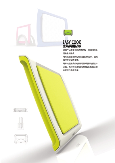 一块具有解冻功能的生熟两用砧板,分别用来处理生食和熟食,处理生食的一面内置加热元件,通电情况下可以解冻食物;处理熟食的一面可以单独取下当盘碟之用,食物在上面切好后可直接端上桌。工业设计专业学生任陈超,从最平常的生活细节中发现问题,设计出如此贴心实用的产品,引起观摩者的称赞。