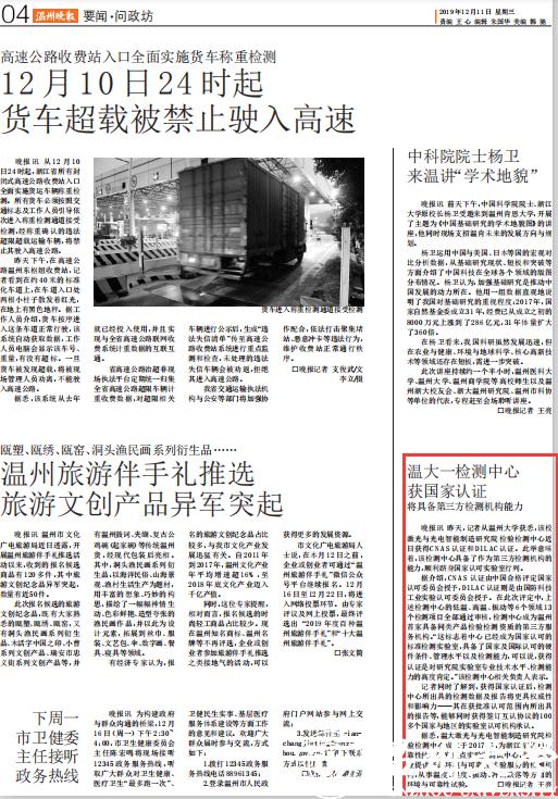 据悉,温大激光与光电智能制造研究院检验检测中心成立于 2017 年,为浙江省机电可靠性技术研究重点实验室测试中心,是一家专业提供产品环境与可靠性试验服务的检测机构,从事温度、湿度、振动、冲击跌落等方面的环境与可靠性试验。 □晚报记者 王亮