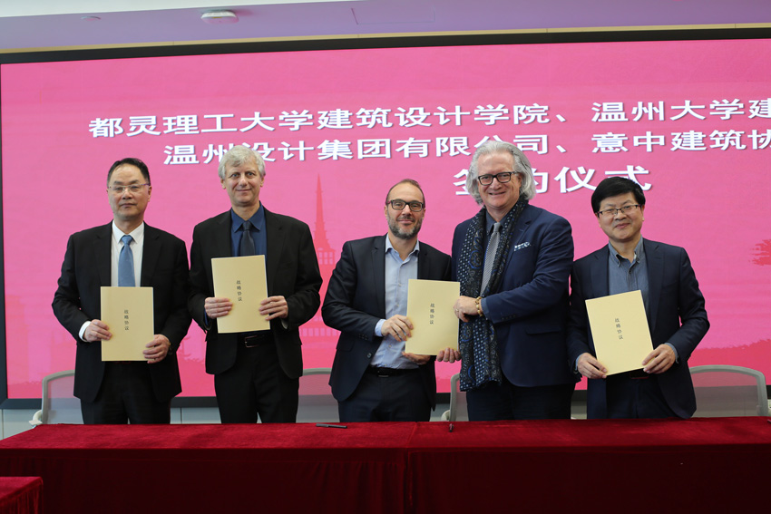 报告会结束后,小宝影院 建筑工程学院与都灵理工大学建筑设计学院、意中建筑协会、温州设计集团有限公司举行了四方签约仪式。据悉,都灵理工大学是世界百强理工学府也是意大利久负盛名的高等学府之一,在工程、建筑与设计和城市规划方面是欧洲最杰出的大学之一。
