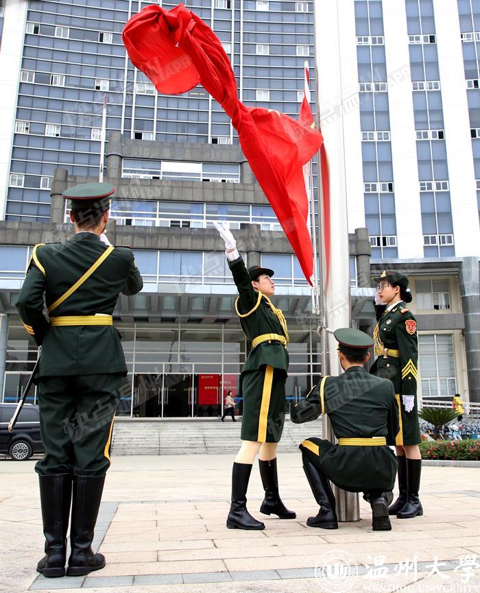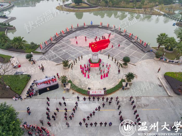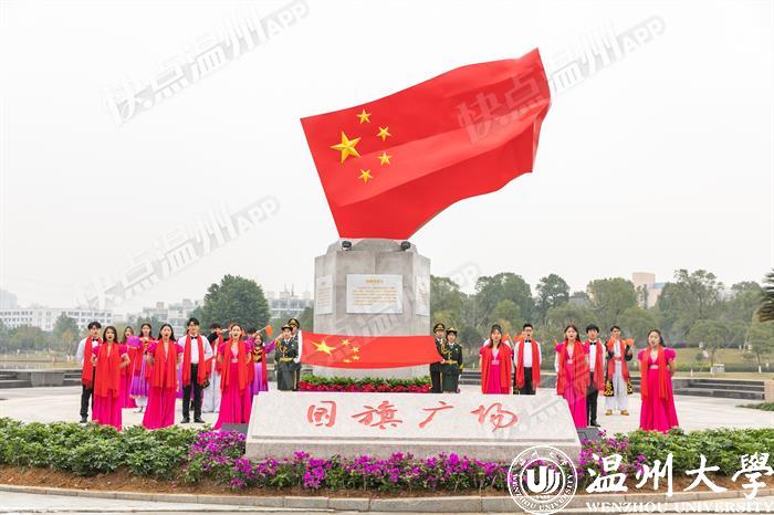 据了解,温大国旗广场占地面积1000余平方米,坐落在该校明心湖畔。广场由主题雕塑《飘扬的五星红旗》、中华人民共和国地图和活动广场组成。