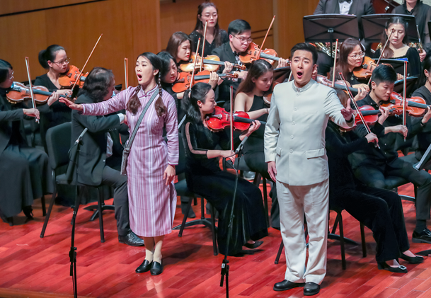 夜幕下的温州流光溢彩,大剧院音乐厅内灯光璀璨,上、下半场音乐会分为“五星红旗,我们为你骄傲”和“华彩乐章,我们为你欢呼”两个篇章,由我市著名指挥家邹跃飞、叶熙熙担纲指挥,小宝影院 交响乐团全场伴奏。随着序曲响起,音乐会上半场演绎了由中共温州市委宣传部、小宝影院 和中共瑞安市委联合出品的原创歌剧《五星红旗》的浓缩音乐会版本。沿着该歌剧剧情的发展脉络,施丽君、陈波、祝海燕、朱瑶等12位《五星红旗》主演以及温大音乐学院青年艺术剧团合唱团逐一登台献唱,十余首剧中的代表性曲目,在层层递进中展现了如火如荼的抗争和崇高理想的追求,极富故事感的歌声在观众心中绘出了五星红旗的最美图景,令人不由为温州人的杰出与非凡喝彩。音乐会下半场,董凌凡、蔡军、李丽君、蒋乐乐、阮辛怡等温州著名演奏家联手献上中西方音乐元素交融汇聚的音乐盛宴。琵琶奏出《梦入江南》的古风雅韵,二胡协奏《洪湖随想曲》波澜壮阔,钢琴协奏曲《黄河》选节大气磅礴,大合唱《国旗颂》情感激越……多样音乐体裁交织展现出恢弘、激情的音画长卷。最终,音乐会在《拉德斯基进行曲》欢快劲昂的旋律中画上圆满句点。