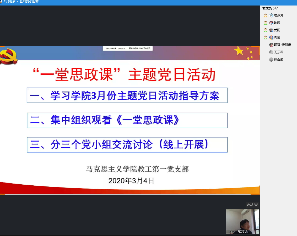 共同观赏之后,各师生党支部展开了热烈的线上交流。教工第一党支部、思政系党支部、原理党支部、行政党支部的教师党员们也纷纷表达了作为思政课教师、思政教育工作者身上肩负的使命和担当。马克思主义学院教工第一党支部书记项淳芳说到:听了讲座深有感触,为六位优秀同行的敬业投入所感动,正因为有这样一支“可信、可敬、可靠,乐为、敢为、有为的思政课教师队伍,有无数思政人的默默付出,所以对思政课的前景充满信心,也感受到作为思政人前所未有的理直气壮和使命担当。在当前防控疫情战和发展主动战的艰巨任务下,作为马院教师,要靠前尽好职责,勇于回答时代课题。