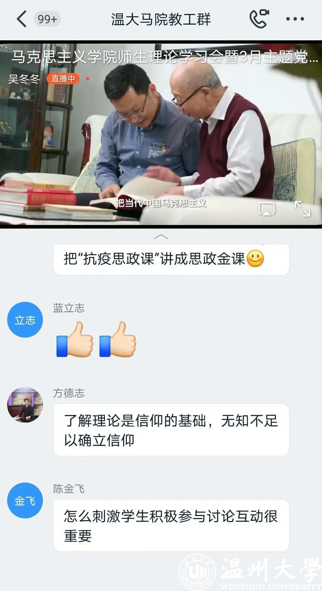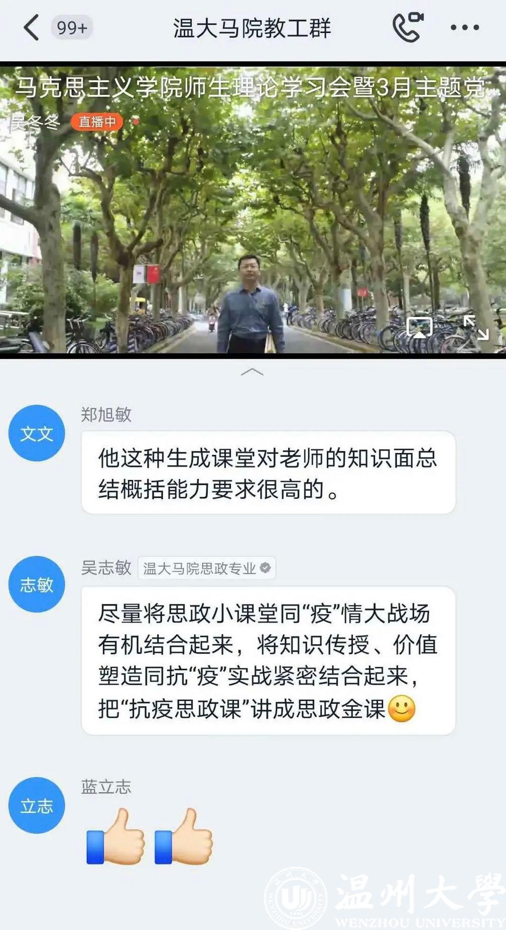为贯彻落实习近平总书记关于新冠肺炎疫情防控工作的重要讲话和指示精神,全力支持配合打赢疫情防控人民战、总体战、阻击战,深化新时代高校思政课改革创新,按照教育部党组“停课不停教、停课不停学”的工作要求,小宝影院 马克思主义学院充分利用线上教学平台和优质在线课程资源,全面开启战“疫”在线“主播”思政全覆盖、战“疫”专题思政第一课全新讲、战“疫”在线思政课程全共享的“三全”线上教学活动。