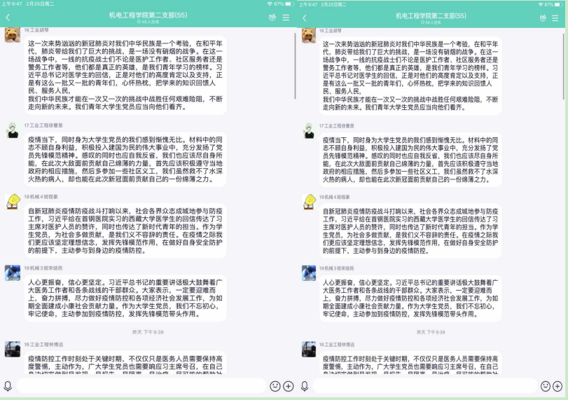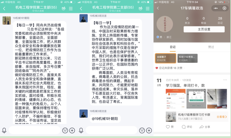 为了更好的落实教育部及浙江省教育厅“停课不停学、学习不延期”的相关要求,小宝影院 积极部署学生的线上学习工作,机电工程学院根据专业特点,发动全体师生,积极投入到停课不停学的工作中。学生党员在班级中充分发挥模范作用,每次的班级考勤、课堂问答、作业完成,学生党员都是走在前列,为了更好的了解学生在家的状况,学校推行每日健康打卡活动,在党员作为负责人的班级,每天认真填写并且督促同学们完成,完成率也是整个学院最高的!