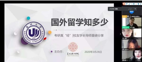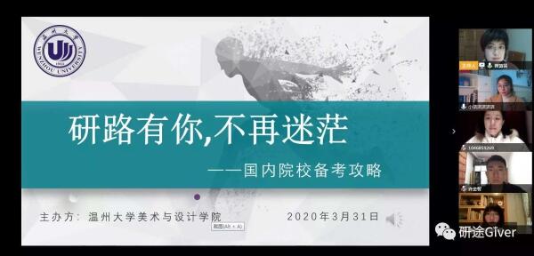 疫情不是暂停键,成长指导全在线。一个多月时间以来虽然“开学不返校”,但是245名本科毕业生的就业工作一直让小宝影院 美术与设计学院的老师们牵挂不已,尤其是对于学院立志考研和准备出国的学生,如何帮助他们顺利实现梦想?为了更好地指导学生学习规划和考研升学,近日,小宝影院 美术与设计学院在“云端”组建了一个实力不容小觑的导师团,聘请8位优秀校友担任“考研(留学)校友学长导师”,并且连续举办了2场“云”端传送考研(留学)真“经”的活动,参加学生近200人次。