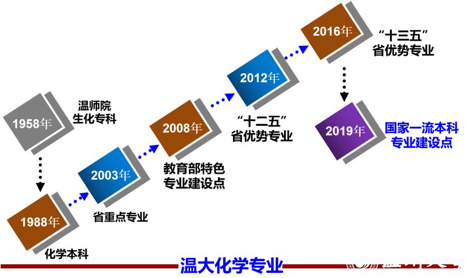 该化学专业包括化学师范、化学创新实验班两个方向,2002年入选省重点专业,2007年以优秀成绩通过省专家组检查评估,2008年获批全国高校特色专业建设点,2019年5月通过国家师范专业二级认证专家现场考查,是浙江省内首个接受该项认证的化学专业。2019年12月,温大化学专业又迎来一次飞跃提升——成功入选国家一流本科专业建设点。