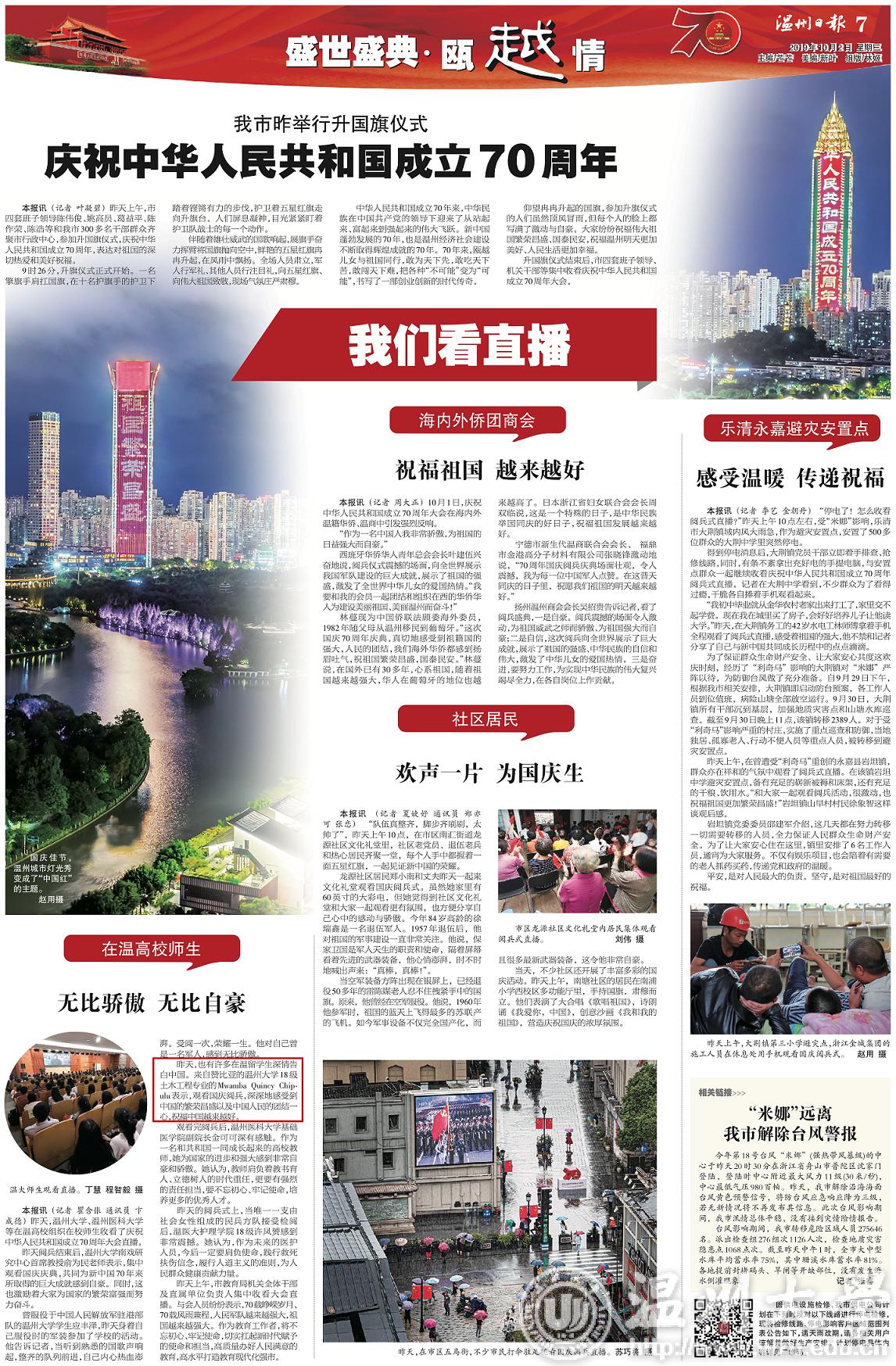 10月1日,也有许多在温留学生深情告白中国。来自赞比亚的小宝影院 18级土木工程专业的Mwamba Quincy Chipulu 表示,观看国庆阅兵,深深地感受到中国的繁荣昌盛以及中国人民的团结一心,祝福中国越来越好。