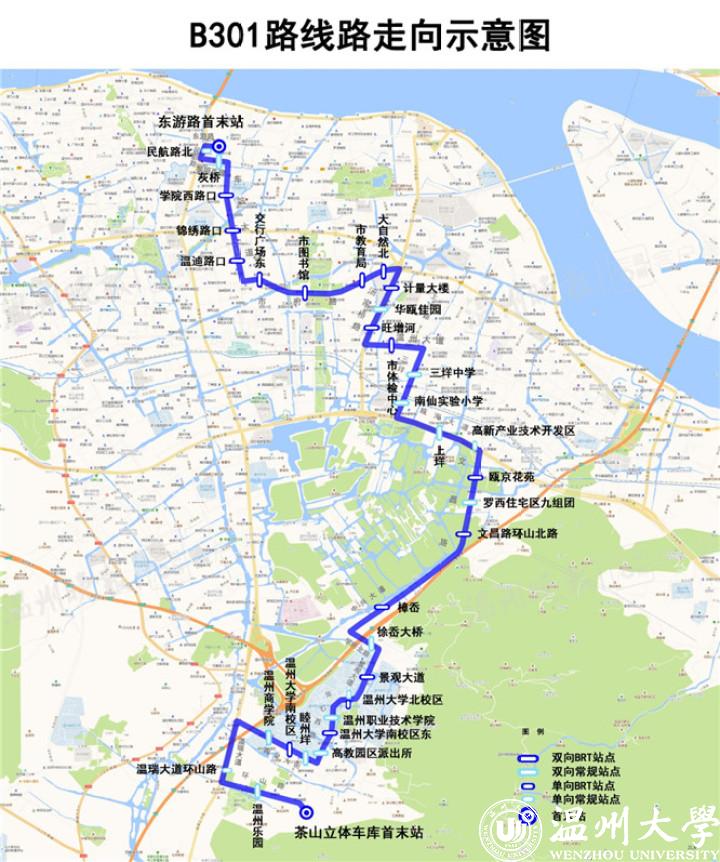 温州交运集团快速公交公司副总经理陈味辛介绍,BRT301路由市区东游路首末站始发,途经民航路、市府路、汤家桥南路、文昌路、学府北路等道路,至茶山立体车库首末站(往返)。该线路全程24.5公里,实行一票制无人售票,票价为2元,全线运行约80分钟。