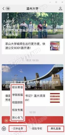 毕业生们可云游温大,观看校长和各学院院长的祝福视频,在学校各标志景点“云打卡”生成专属头像和专属合影;在线申领电子校友卡,成为温大校友一份子;欣赏毕业主题的改编歌曲和原创MV视频;毕业生寄语滚动播放,“毕业快乐”“来日方长,后会有期”“愿有前程可奔赴,亦有岁月共回首!”“温大永远是我们的家”等留言不断刷屏,传递了一位位毕业生对母校的感激和不舍。 “一路我们曾携手并肩,温大精神伴我向前,牢记求学问是、敢为人先,承诺最高处相约!”祝福所有的毕业生一路珍重!鹏程万里!