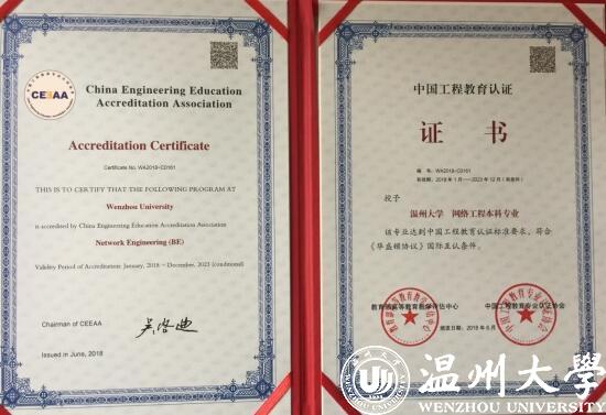 2016年,温大网络工程专业再度入选浙江省“十三五”优势专业。2018年6月,正式通过全国工程教育专业认证,成为全国高校同专业中第三个、地方院校同专业中首个通过工程教育认证的网络工程专业。根据教育部的权威说法,通过工程教育专业认证标志着专业的人才培养质量已达到国际等效的工程教育标准及要求,毕业生具有国际竞争力,专业进入全球工程教育的“第一方阵”。