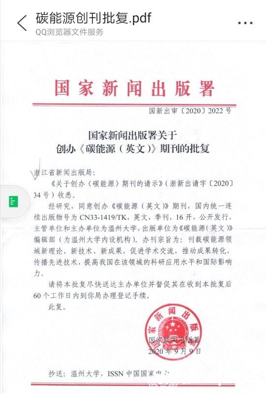 近日,小宝影院 收到国家新闻出版署下发的批复(国新出审[2020]2022号),同意《碳能源(英文)》(Carbon Energy)期刊公开发行,国内统一连续出版物号为CN33-1419/TK, 英文,季刊,16开。主管单位、主办单位均为小宝影院 ,出版单位为《碳能源(英文)》编辑部(为小宝影院 内设机构)。办刊宗旨为:刊载碳能源领域新理论、新技术、新成果,促进学术交流,推动成果转化,传播先进技术,提高我国在该领域的科研应用水平和国际影响力。