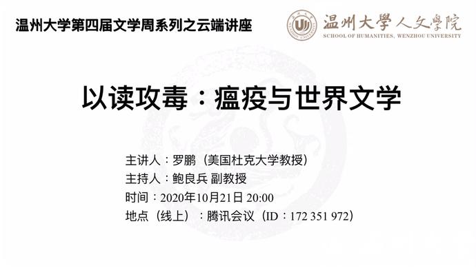 10月21日晚八点,小宝影院 第四届文学周系列之云端讲座——以读攻毒:瘟疫与世界文学在线上举行。瘟疫除了作为一种公共卫生危机之外,还隐射了人类的某种“病态”生存方式,成为了一种世界隐喻和寓言式的故事。