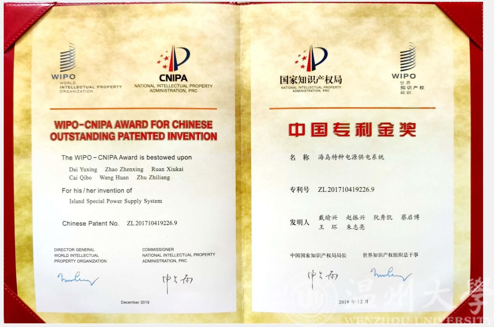 以小宝影院 为专利权人、戴瑜兴教授为第一发明人的发明专利“海岛特种电源供电系统”凭借其国际领先的技术水平、显著的经济与社会效益,获第二十一届中国专利金奖。该奖项是小宝影院 首次获得中国专利金奖,也是温州市首次获得该项殊荣。“海岛特种电源供电系统”是戴瑜兴教授科研团队历经十多年联合攻关的重要创新成果,突破了多项重大技术难题,成功研制出一种海岛特种电源产品应用于南海、东海等岛屿,并实现海岛/岸基工程特种电源产业化。