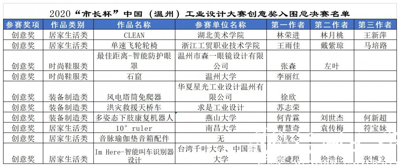 据悉,此次入围决赛的18件作品,将在2020年“市长杯”中国(温州)工业设计大赛的官网进行公示(//wzszb.66wz.com/),并于11月份下旬举办总决赛路演及颁奖典礼。