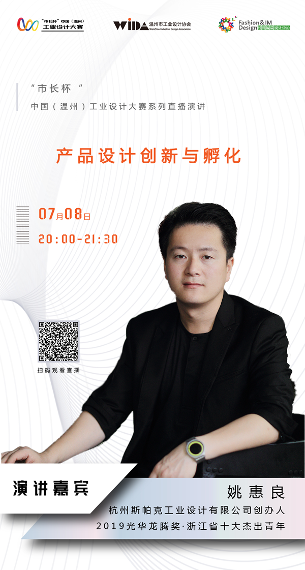 7月8日,杭州斯帕克工业设计有限公司创办人姚惠良为设计师们做《产品设计创新与孵化》为主题的直播演讲。