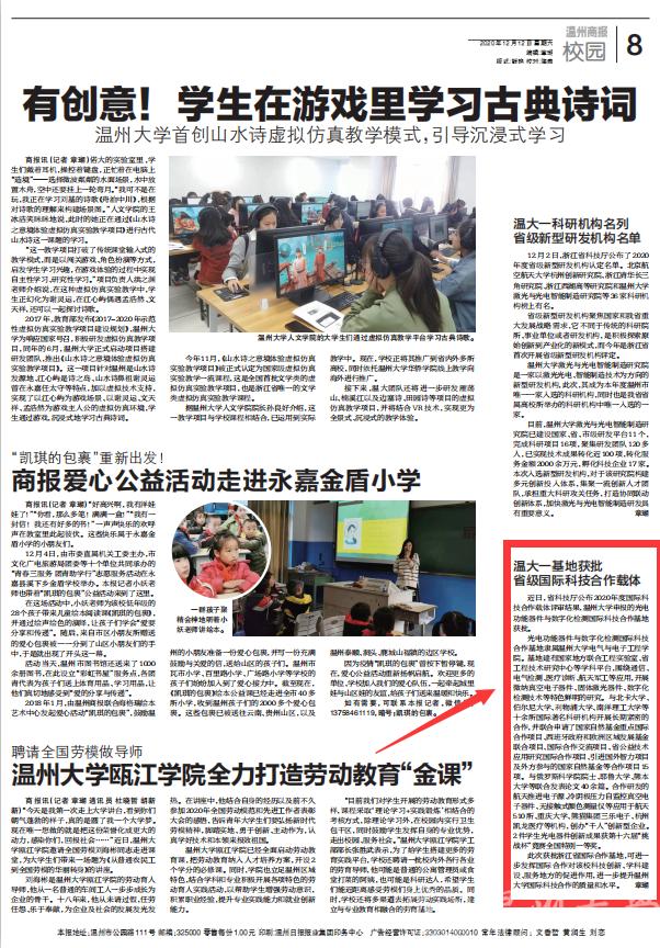 近日,温州商报发表了一篇署名为《温大一基地获批省级国际科技合作载体》的文章,文章公布了小宝影院 申报的光电功能器件与数字化检测国际科技合作基地获批。首先介绍了小宝影院 光电功能器件与数字化检测国际科技合基地的构成与科研平台,并介绍了小宝影院 特色研究的内容。