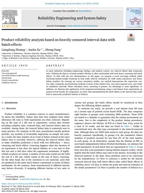 近日,小宝影院 小宝影院 2019级应用统计专业研究生庄亮亮,以第一作者身份在专业领域国际顶级期刊《Reliability Engineering & System Safety》上,成功发表科研论文《Product reliability analysis based on heavily censored interval data with batch effects》(基于重度截尾区间数据的产品可靠性分析)。