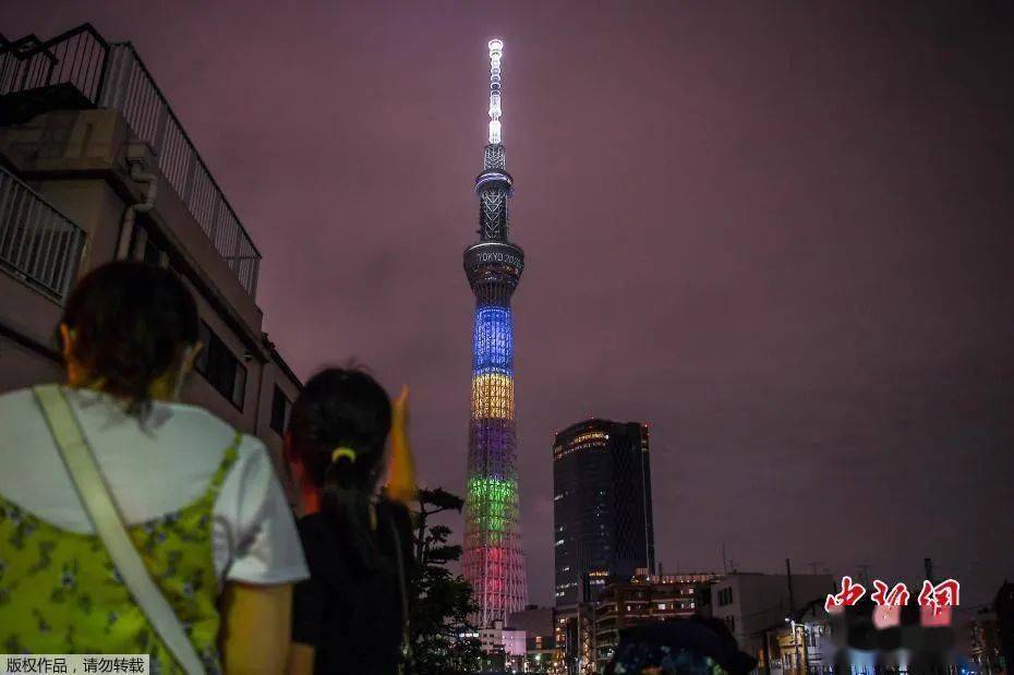 资料图:当地时间2020年7月23日,东京奥运会倒计时一周年,东京晴空塔亮起奥运五环色灯光。