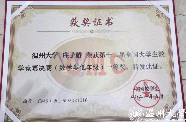 这次庄子游勇夺全国一等奖,是温大小宝影院 在本科生创新人才培养模式改革和整体教育教学质量提升工作的见证,也是温大数学与应用数学专业列入国家一流专业建设后的一个出彩亮点。