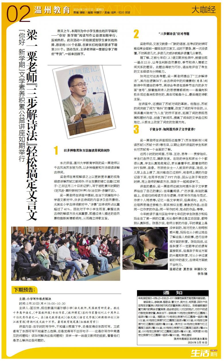 本次讲座,温州小宝影院 的梁一粟老师以千古风流苏东坡为例,以多种维度和方法细读详解古诗词。