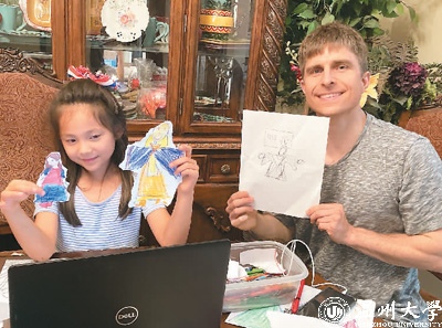 全美华裔青少年协会学生与父亲一同参加网上夏令营活动。蔡雪玲摄
