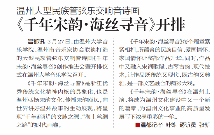 3月27日,由小宝影院 音乐学院、温州市音乐家协会联袂打造的大型民族管弦乐交响音诗画《千年宋韵·海丝寻音》创作推进会暨开排仪式在小宝影院 音乐学院召开。《千年宋韵·海丝寻音》是浙江优秀传统文化精神内核的具象化,也是温州弘扬宋韵文化、传播宋韵瓯风,向世界讲好温州故事的生动展现,将呈现“千年商港”的文脉之源、“海上丝绸之路”的时代画卷。