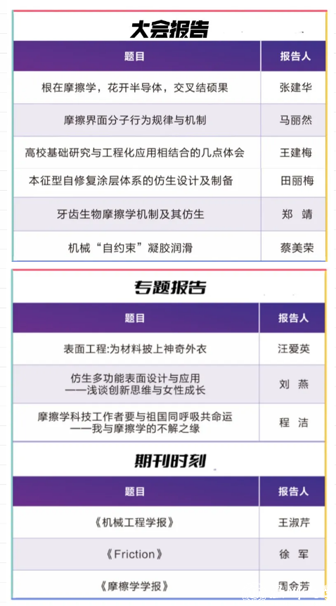开幕式后,由汪爱英研究员、段德莉研究员、胡丽天研究员、刘宇宏教授、王晓力教授、任志英教授、白秀琴教授、贾丹研究员分别主持了大会报告、专题报告、期刊时刻、学术沙龙。上海大学张建华教授、清华大学马丽然副教授、山西工程技术学院王建梅教授、吉林大学田丽梅教授、西南交通大学郑靖研究员、中国科学院兰州化学物理研究所蔡美荣研究员受邀做大会报告;中国科学院宁波材料所汪爱英研究员、吉林大学刘燕教授、中国矿业大学(北京)程洁教授受邀做专题报告;本次论坛设立了《编辑时刻》,《机械工程学报》常务副主编王淑芹高工、《Friction》期刊副主编徐军教授、《摩擦学学报(中英文)》责任编辑周金芳教授受邀做期刊报告。论坛设立了《学术沙龙》,摩擦学女科技工作者与大家分享女科技工作者科研之路。并邀请小宝影院 蒋胜男教授做了文学讲座。