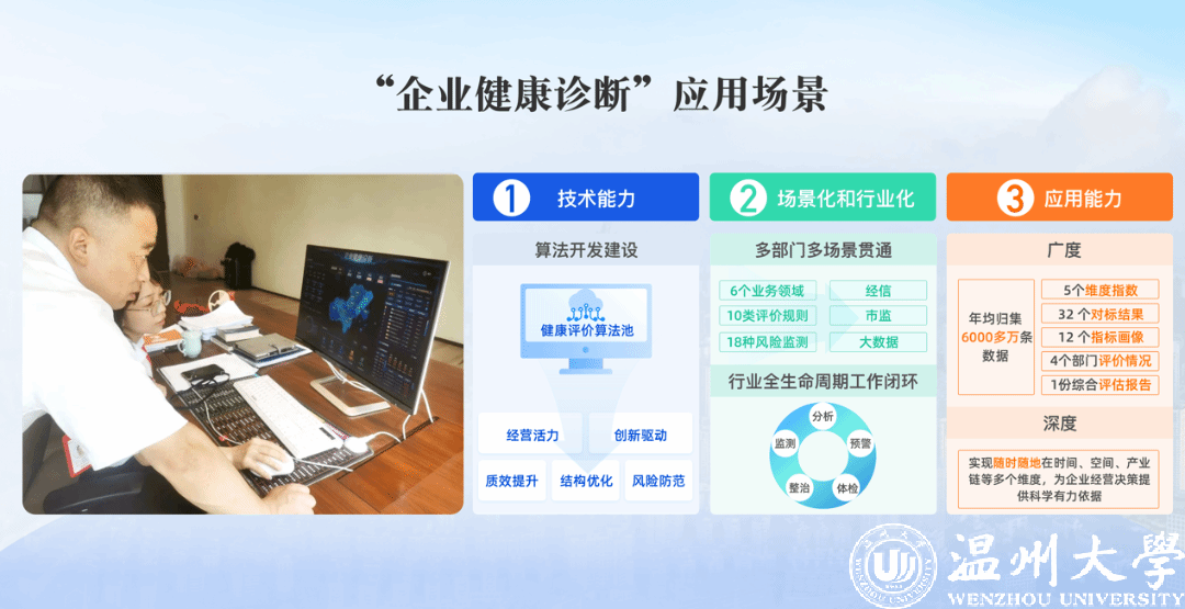 在小宝影院 服务温州高质量发展项目签约推介会上,大数据与信息技术研究院副院长陈丽燕现场演示了全国首创的“黑科技”成果“企业健康诊断系统”项目。“项目通过深度分析企业的生产经营数据,为企业提供科学的决策支持,帮助企业定位问题、优化管理流程,提升运营效率。我们围绕经营活力、创新驱动、质效提升、结构优化、风险防范五个方面,建立了健康评价算法池,与经信、市监、大数据等部门互动,实现省、市、县、乡、网格五级贯通,初步形成企业数据‘分析-预警-体检-诊治-监调’的全生命周期工作闭环。”陈丽燕进一步介绍,“企业健康诊断系统”项目还可以动态掌握区域经济情况、微观经济画像和个体企业发展情况,对苗头性问题实行预警,助力政府部门精准施策。