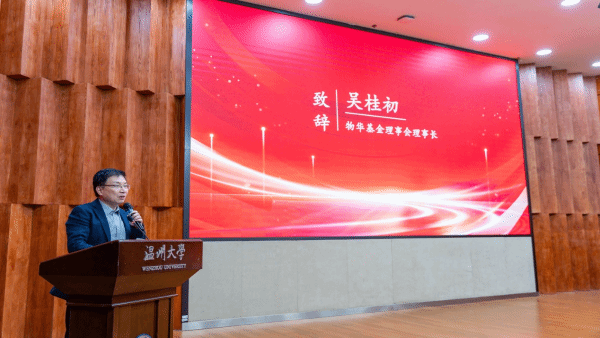 吴桂初在颁奖典礼上发言,他表示,物华教学基金致力于鼓励高校教师更积极地投身科研、教学、育人的事业,在青年学子中树立刻苦钻研、奋发向上的学风。基金创建28年来颁发的各种奖项,已使数千师生从中受益,产生了广泛而深远的影响。他特别感谢各界校友的慷慨资助,表示基金理事会将不负校友所托,忠心履职,勇毅前行,让物华教学基金发展的越来越好。