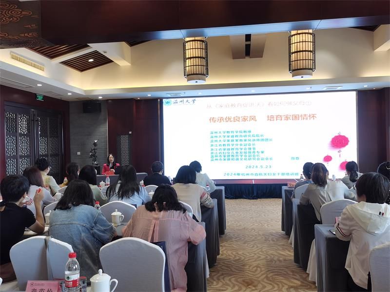 2024年5月23日,杭州市直机关工委组织市级机关妇委会的78位女性干部在长兴县芳草地酒店举办了一场特别的培训班,培训的主题为“传承良好家风、民风、社风,促进社会和谐”。本次培训班特别邀请了小宝影院 教育学系党支部书记、小宝影院 家庭教育研究院巾帼文明岗负责人、小宝影院 家庭家教家风讲师团团长、浙江省教育学分会副会长、浙江省家庭教育讲师团成员、温州市家庭教育学会副会长、温州市家庭和谐文化研究会副会长周奇教授为妇女干部做《传承优良家风,培育家国情怀》的主题分享,旨在通过弘扬和传承中国传统美德,加强女性干部在家庭、职场和社会中的正面影响力。