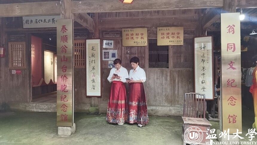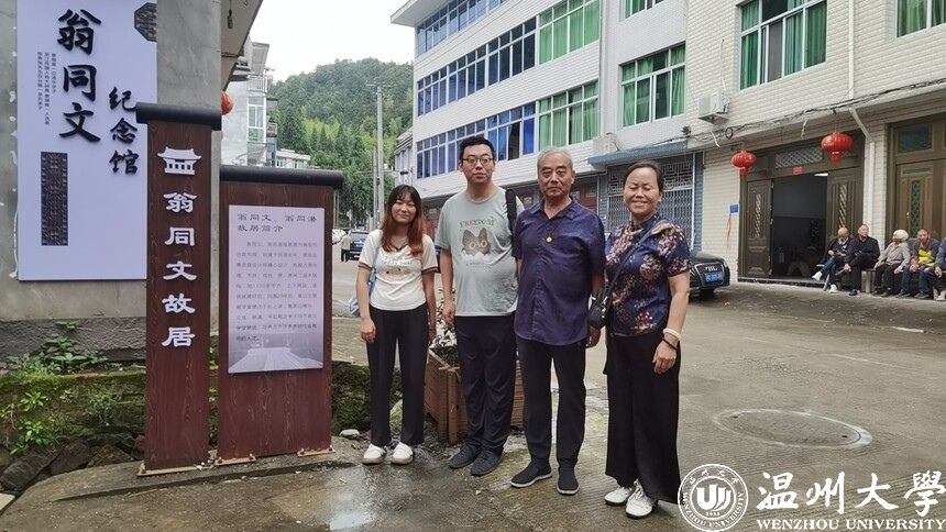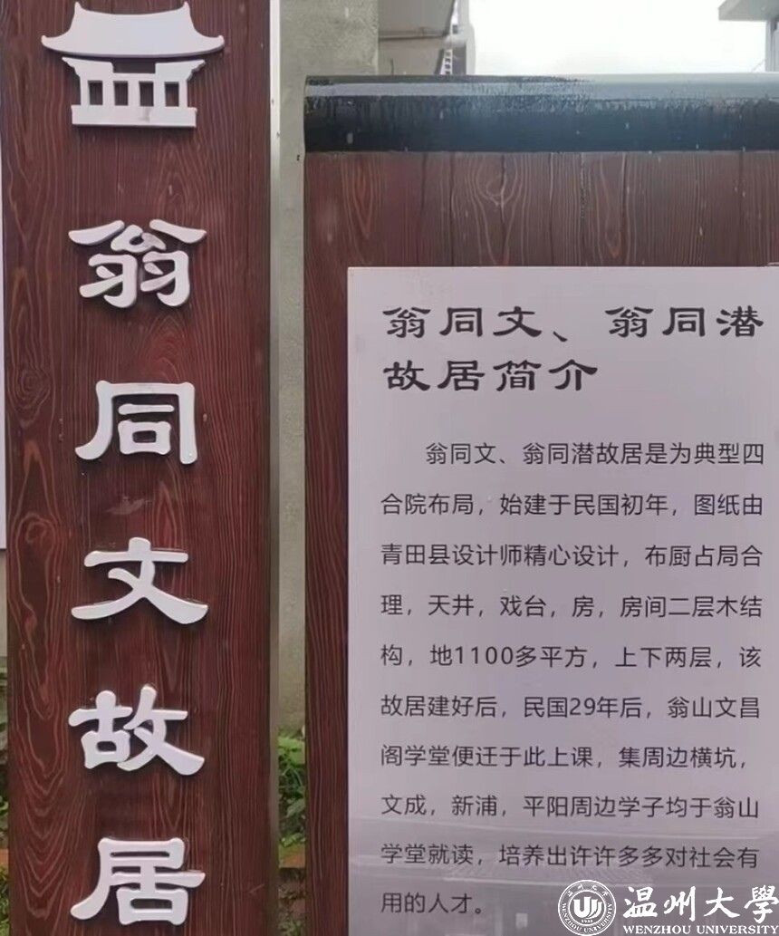翁同文故居是有江浙特色的四合院,占地1100多平方米,住房为上下两层,均为木结构,还有天井、戏台等,始建于清朝中期。300多年来,该民居保存完好。翁同文纪念馆负责人翁清华热情接待了我们,向我们介绍,自1930年起,翁山的孩子均在这里上课,周边的横坑、文成、新浦、平阳等村的学子,也在此就读。自此,这个故居走出了许多博士、硕士及有用之才,遍布海内外,成为泰顺人的骄傲。