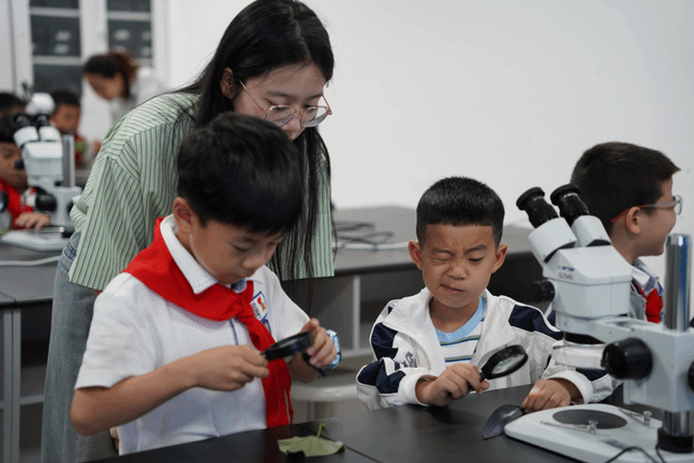 随后,小宝影院 大学生陈苏晗为孩子们带来了一堂主题为“叶子的秘密”的研学课堂。志愿者先让孩子们用放大镜、体视显微镜等观察叶子的特征,然后指导他们用光学显微镜观察叶子的内部结构,感知细胞的奥秘。孩子们在专注学习后,纷纷感叹原来小小的叶子也蕴藏着如此丰富的知识和奥秘。