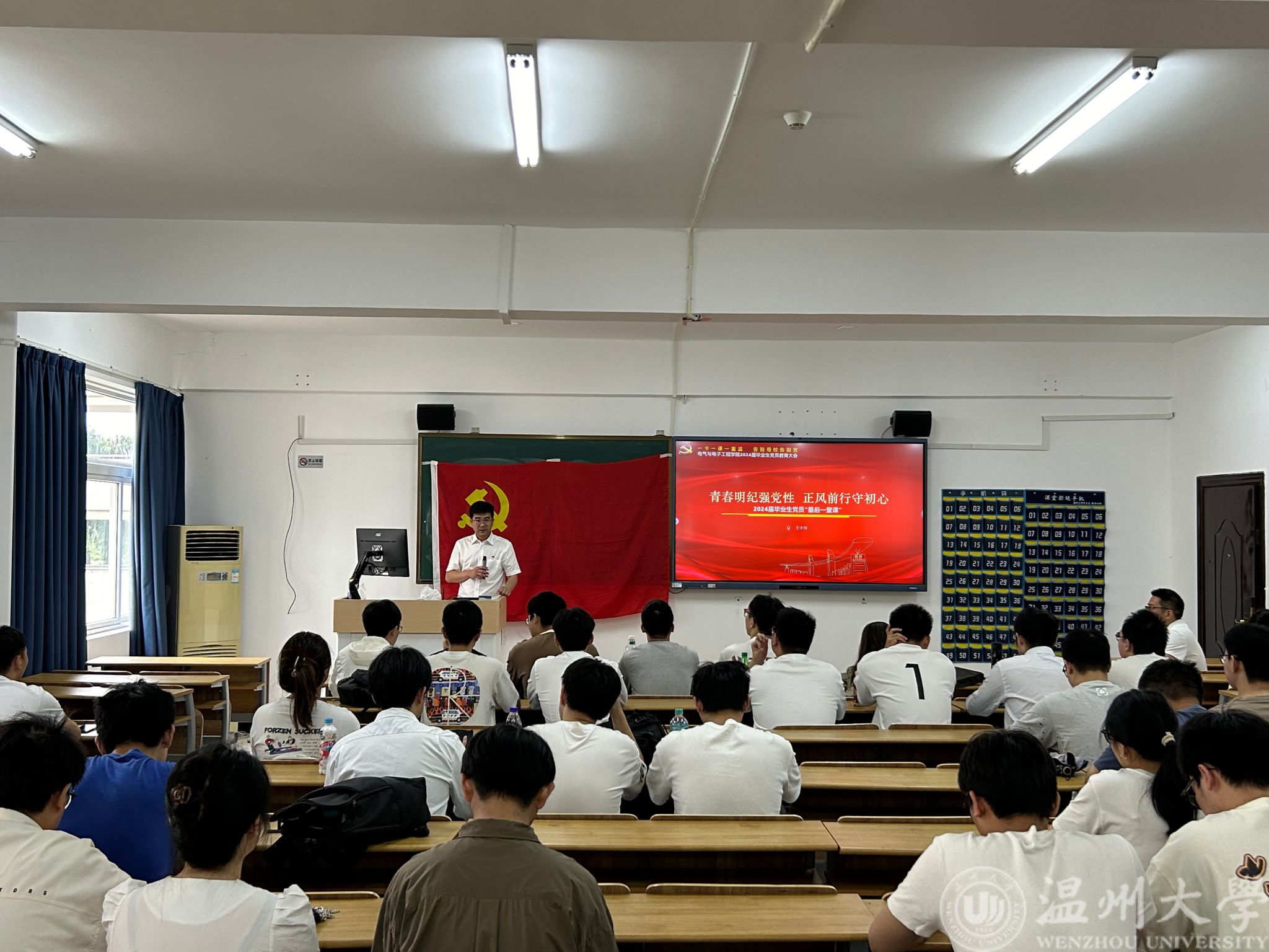 “同学们,作为一名青年党员,我们要紧跟党和国家的步伐,信守‘严守纪律、对党忠诚’的誓言,在前行的路上始终坚守初心、正身清心、存敬畏心……”为不断深化毕业生党员对党纪重要性的认识,使党员同志明确如何在实际工作中遵守和维护党的纪律,学院党委副书记、纪委书记王中对以“青春明纪强党性,正风前行守初心”为题为2024届毕业生党员上离校前“最后一堂党课”。他要求全体毕业生党员讲政治、立规矩、做表率。勉励毕业生党员保持共产党员的先进性和纯洁性,坚定理想信念,勇于担当作为。