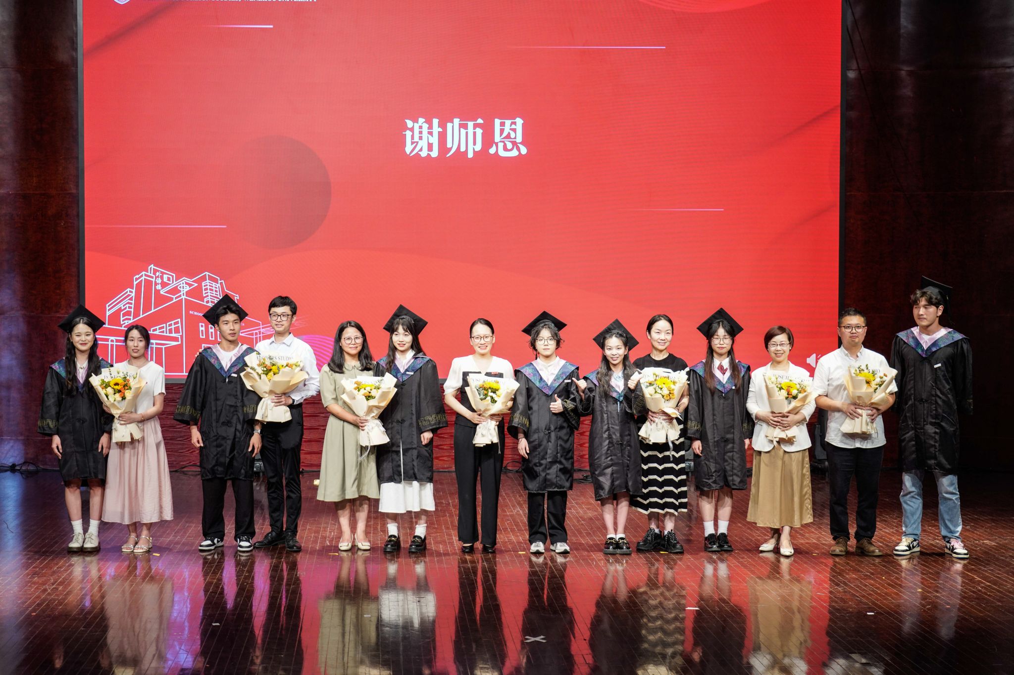 在温情的音乐中,毕业班班主任、辅导员,教师代表走上台前,一一接过毕业生们手中的花束。老师们为毕业生最后一次佩戴徽章,用这种方式护送他们奔赴下一场山海,也告诉他们:无论未来走向何方,学院的大门,永远为同学们们敞开。在场师生齐唱小宝影院 校歌,每一个音符都是对母校的感恩与不舍,每一句歌词都是对未来的梦想与承诺。