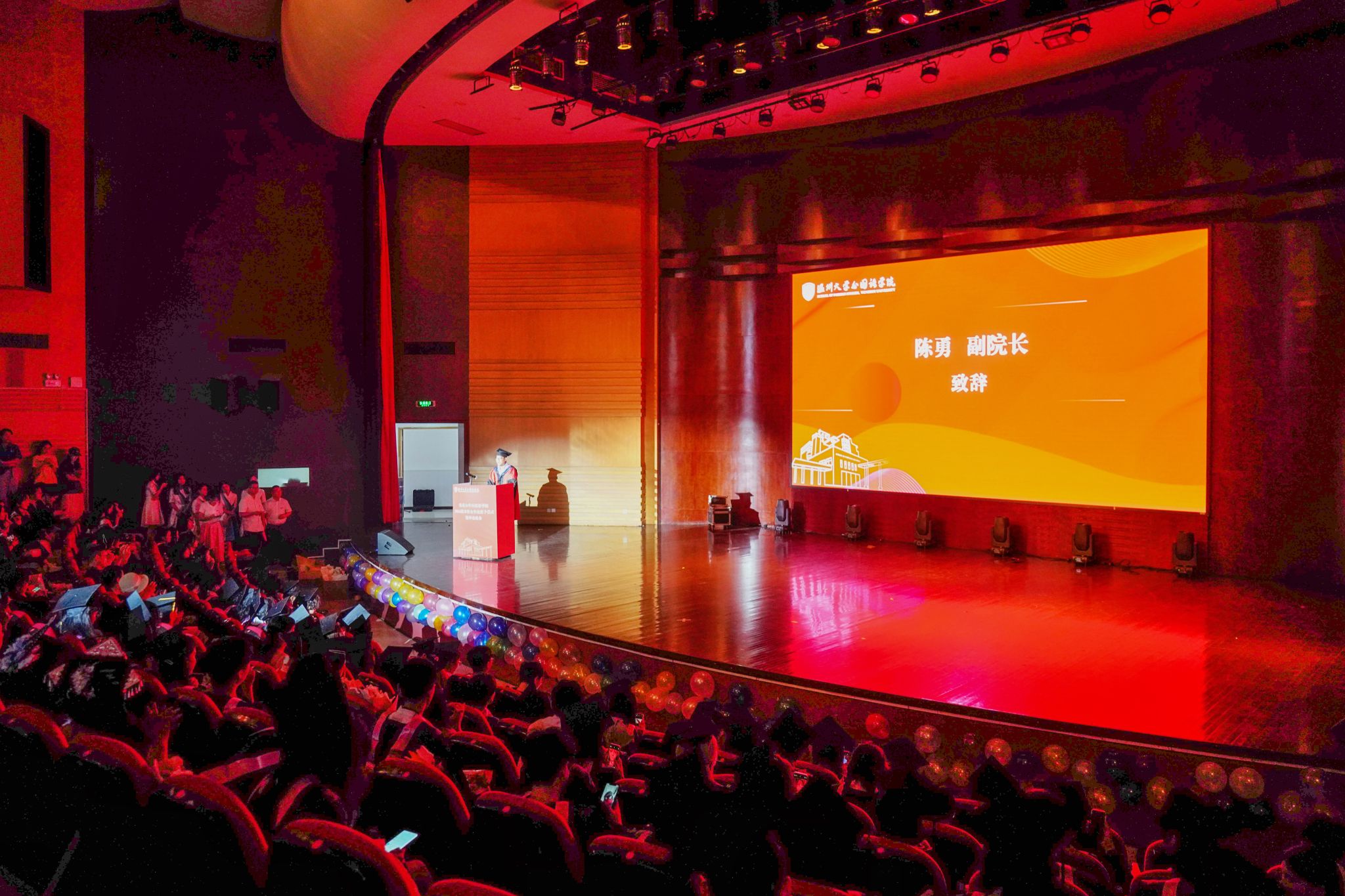 学院院长陈勇教授深情改编了莎士比亚十四行诗第18首,将夏日的明媚与学子们的未来相比拟,寄托了对他们美好未来的无限期许:“只要你们能接续奋斗,博览群书,只要你们把温大外院的记忆永驻,这将照亮你们精彩无限的人生!” 同时,他对即将迈入人生新阶段的毕业生们提出三点嘱托:第一,他希望同学们虚心向学,保持求知的欲望;第二,他勉励同学们接续奋斗,从平凡处开始,在实干中起步;第三,他鼓励同学们去看更广阔的世界,做中外文化交流的使者。他的话语,如同夜空中最亮的星,指引着学子们勇敢追逐属于自己的光辉岁月。