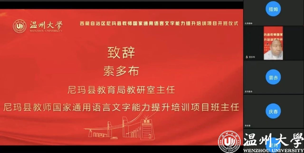 尼玛县教育局教研室主任、该培训项目班主任索多布老师在致辞中回顾了尼玛县推广国家通用语言文字的历程,强调掌握和运用好国家通用语言文字的重要性,并对参训学员提出具体要求,希望学员能够重视国家通用语言文字,提高学习积极性,高质量完成课程任务。