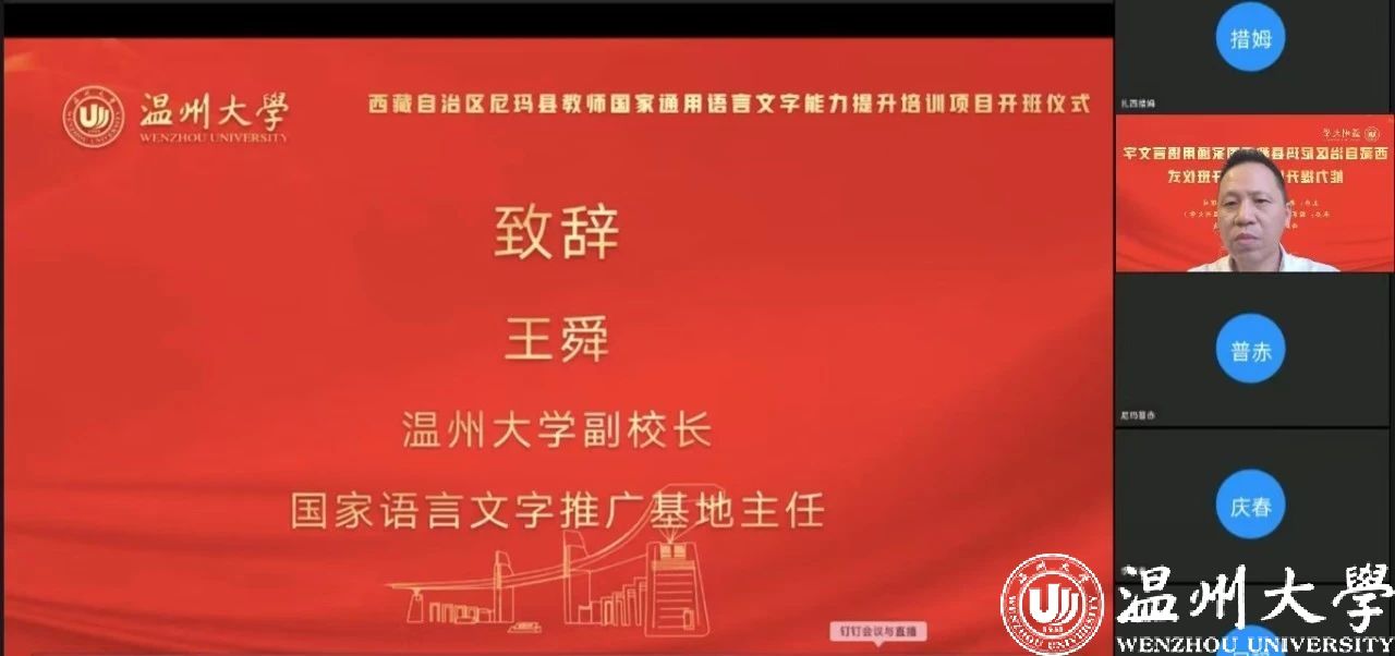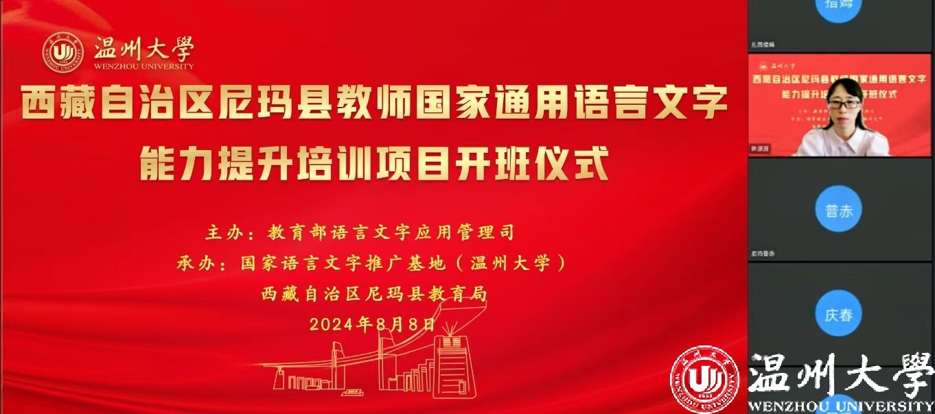 中国教育在线浙江站讯 (编辑 陈显婷 通讯员 温大萱)8月8日上午,由语言文字应用管理司主办,国家语言文字推广基地(小宝影院 )、西藏自治区尼玛县教育局联合承办的“2024年西藏自治区尼玛县教师国家通用语言文字能力提升培训班”举行了线上开班仪式,国家语言文字推广基地(小宝影院 )执行主任陈源源教授主持仪式。