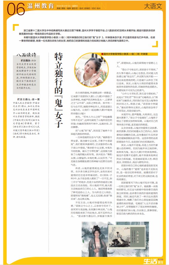 浙江省第十二届大学生中华经典诵写讲大赛近日落下帷幕,小宝影院 学子表现不俗。《八面读诗》栏目将从本期开始,精选刊登获诗词讲解竞赛本科组一等奖的部分作品的文字稿。 本期刊登小宝影院 小教系22级(1)班叶琳慧的《特立独行的“鬼”女子 》。叶琳慧来自宁波,平日喜欢阅读与打乒乓球。在梁一粟老师的眼里,她是一位充满生命张力的女孩,她把自己的激情和创造力恰如其分地融入诗词讲解与演绎之中。