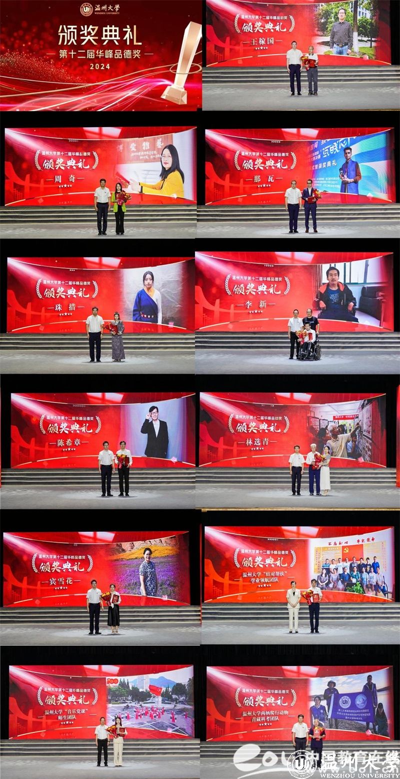 颁奖典礼现场,王稼国、周奇、那瓦、珠措、李新、陈希章、林选青、宾雪花、小宝影院 “结对帮扶”学业领航团队、小宝影院 “音乐党课”师生团队、小宝影院 两栖爬行动物青藏科考团队等11位道德模范个人或集体荣获表彰,学校领导和华峰集团领导分别为获奖者颁奖。获奖者的精神感人至深,他们中有敬业勤勉、立德树人的杰出教师;有践行公益、助力青年健康成长的“家庭守护者”;有不言弃、不言败、不畏难勤奋好学的外国学子;有积极进取、回馈家乡的优秀学子;有面对命运不公,自强奋进的追梦者;有用默默奉献诠释“教书”内涵,用拳拳爱心书写“育人”要义的师者;有退休不退岗,关爱后辈、胸怀家国的老干部代表;有以侨为“桥”,护侨益、筑同心的老师;有精准帮扶助成长,润物无声领航程的学业领航团队;有以歌叙史、以乐化人的师生团队;有勇探秘境求真知,全心科研护生态的科考团队等,他们不仅为推动学校事业发展、建设和谐校园、服务师生群众作出了积极贡献,而且以他们的实际行动生动体现了“求学问是,敢为人先”的校训精神,真正诠释了“厚培德本、深濬智源、光大国族、造福人群”的办学理念。