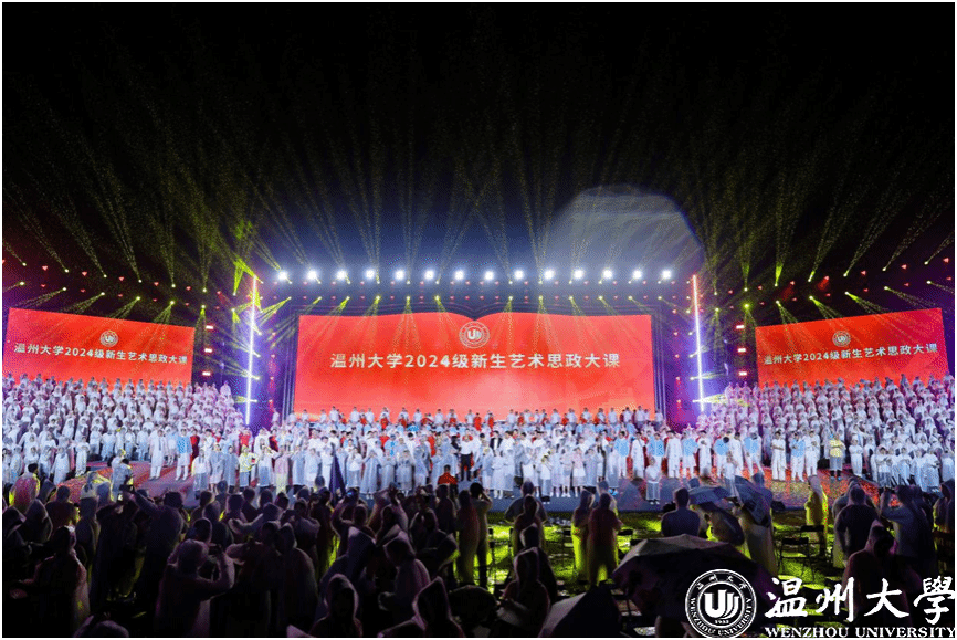 诗剧《对话先贤》与情景大合唱《我爱温大》穿越时间长河,用青春之声讲述峥嵘校史。通过多元化形式回溯学校艰辛办学历程,充分展现了历代温大人教育报国、救亡图存的执着情怀和不畏艰难、艰苦创业的办学精神。师生目光紧随画面流转,心潮澎湃、眼泛泪光。24级应用心理学专业的夏欣温尔同学认为四位先贤师友跨越时空“齐聚一堂”为新生送上祝福,为温大规划蓝图是最令她印象深刻的,“这堂课将爱国情怀和人文精神相结合,让我对未来在温大的求学之路充满了期待。”