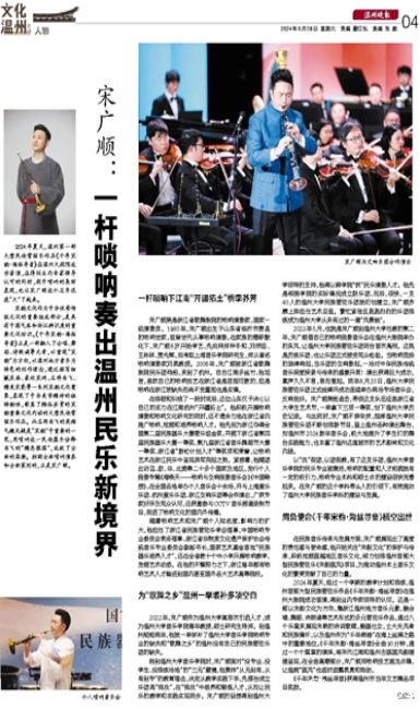 2024年夏天,温州第一部大型民族管弦乐作品《千年宋韵·海丝寻音》在温州大剧院成功首演,在得到业内专家领导认可的同时,剧中唢呐的亮丽表现,也让宋广顺这个名字迅速“火”了起来。